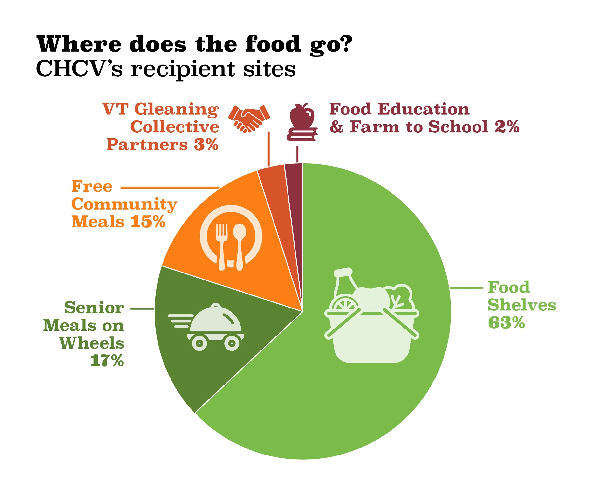 We donate the gleaned food to 30 recipient site partners serving Central Vermonters experiencing food insecurity.