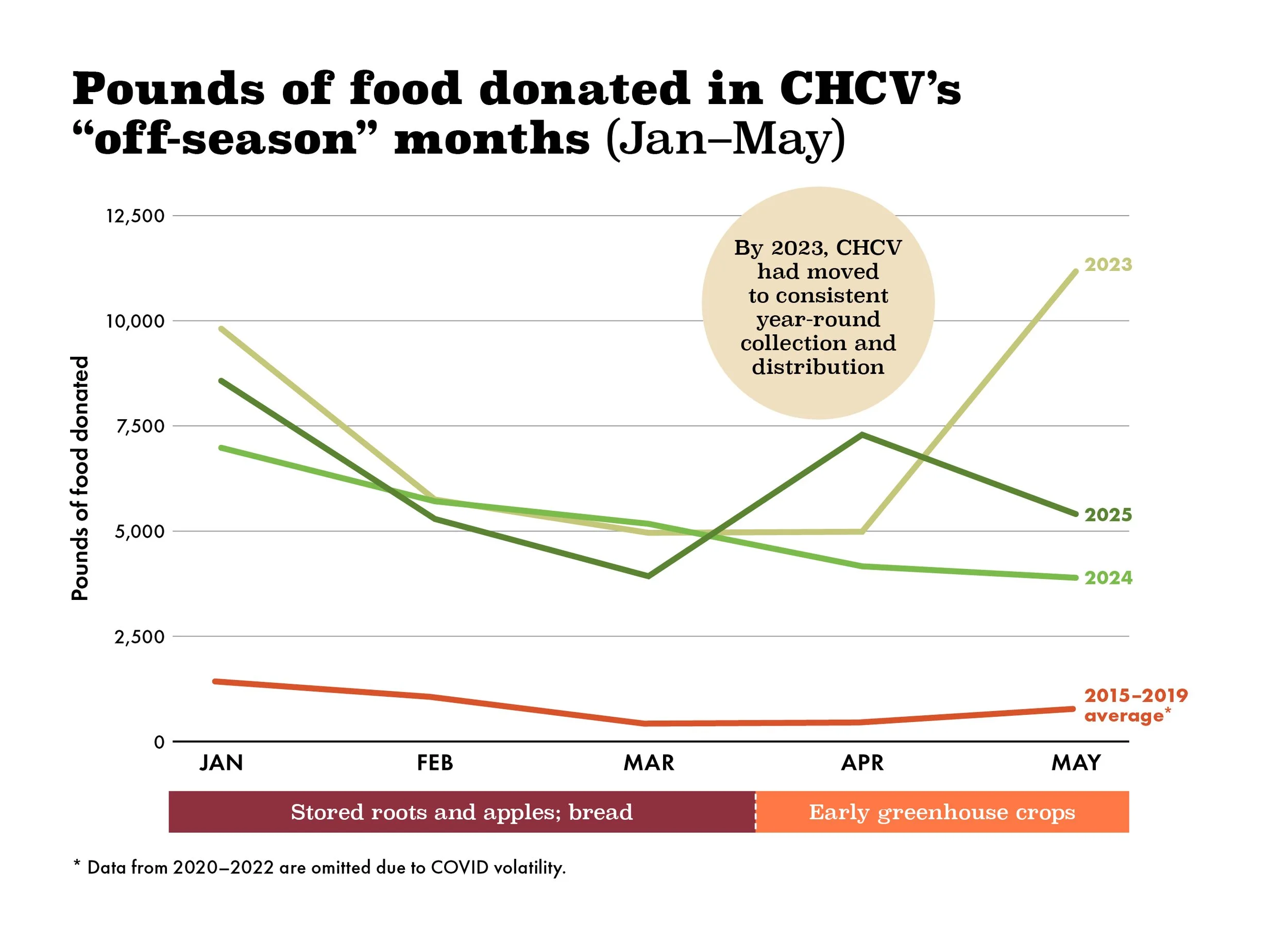 One of the most common questions we are asked is “When does gleaning season end and what do you do during the ‘off-season’?” We proudly answer that, for us, it’s always gleaning season! CHCV has very purposefully built our operation so that we can accept any surplus food at any time. Our work continues year-round – even as fields rest and snow falls. We consistently make food deliveries to our recipient site partners during all 12 months of the year.